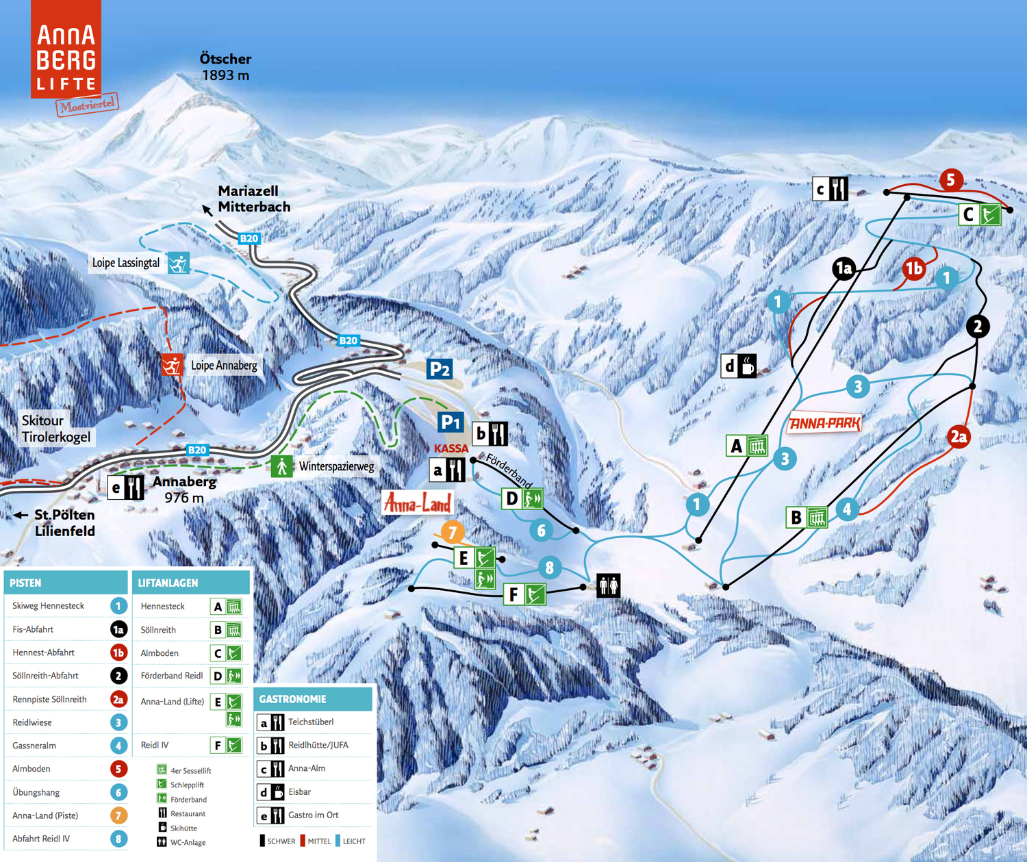 Magyarországról mindössze néhány óra alatt elérhető Annaberg síterepe. A 12,5 kilométer sípálya alkotta sípályarendszer 896-1.334 méter magasságban található. Annaberg hegyoldalán széles, jól belátható és hangulatos, fenyőkkel övezett sípálya szakaszok várják a síelni vágyókat. A 8 kilométer kék jelzésű sípálya ideális kezdő és középhaladó síelőknek, míg a gyakorlottabbak a meredekebb piros és fekete szakaszokon csúszhatnak. Az 1.334 méter magas Henneseck csúcsra a négyüléses Henneseck felvonóval juthatunk fel, ahonnan akár végig lankás szakaszokon síelhetünk a völgyig. Annaberg síterepe családoknak is jó választás, a völgyben kis gyermekpark segíti a tanulni vágyó síelőket. A hegyoldalon alpesi hüttékben pihenhetünk a síeléssel töltött órák között. Annaberg síterepére érvényes síbérlettel a közeli hegyoldalat sípályáit is felfedezhetjük (Mariazell, Mitterbach, Niederalpl).