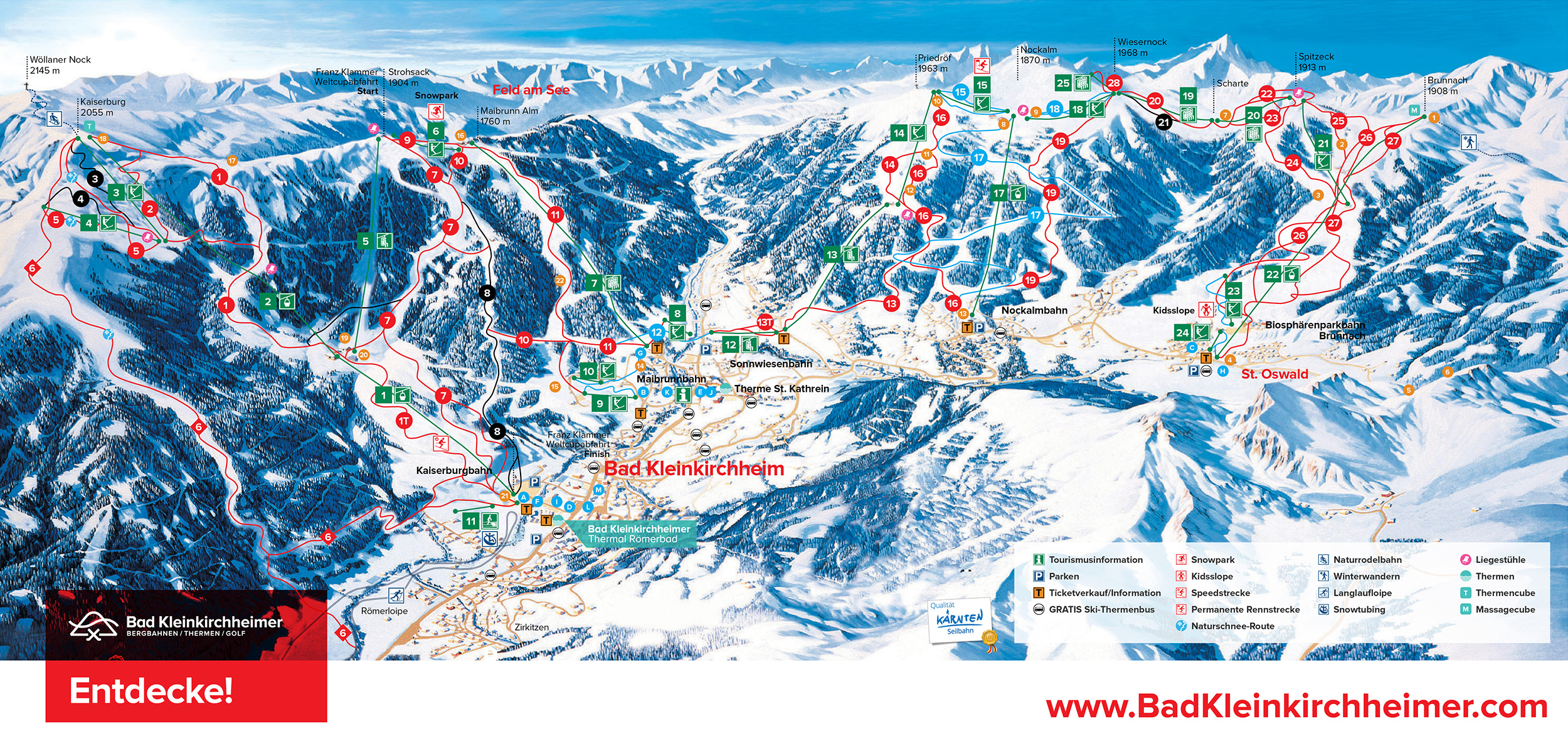 A fürdőiről is ismert Bad Kleinkirchheim téli mottója: A pályáról egyenesen a fürdőbe! A jó adottságokkal rendelkező Bad Kleinkirchheim területén télen 103 kilométer jól kezelt sípálya és két termálfürdő (Római Fürdő, St. Kathrein Fürdő) szolgáltatásait élvezhetjük. A sípályák megfelelő minőségéről közel egy tucat ratrak és több száz hóágyú gondoskodik, amikkel szinte a síterep egészét le tudják fedni. Bad Kleinkirchheim sípályáin különleges fekvésének, kiterjedésének, valamint a napsütéses órák számának köszönhetően síelés közben folyamatosan tudjuk követni a nap járását. Bad Kleinkirchheim büszkélkedhet Karintia leghosszabb (jellemzően piros) sípályáival, ezért leginkább a haladóknak ajánljuk ezt a síterepet.