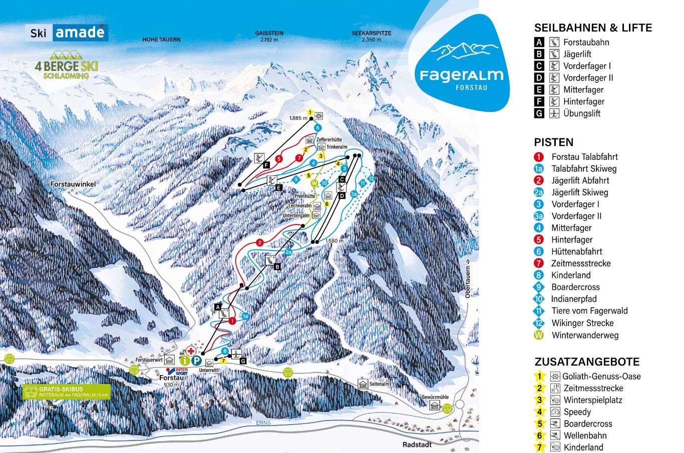 A Ski Amadé részét alkotó Forstau-Fageralm síterepe családoknak és kezdő síelőknek is kiváló választás. A gyerekeket a régió legjobb síiskolája és 3 tematikus síút is várja. A 930-1.885 méter magasságban fekvő lankás hegydalon piros és kék jelzésű sípályákat találnak a síelés és a snowboardozás kedvelői. Forstau-Fageralm 15 kilométeres sípályarendszerébe Forstau településről induló kétszemélyes ülős felvonóval lehet becsatlakozni. A sípálya felső részén húzós felvonókkal lehet feljutni egészen a 1.885 méter magas hegycsúcsra, ahol többségében lankás pályaszakaszokat találunk.