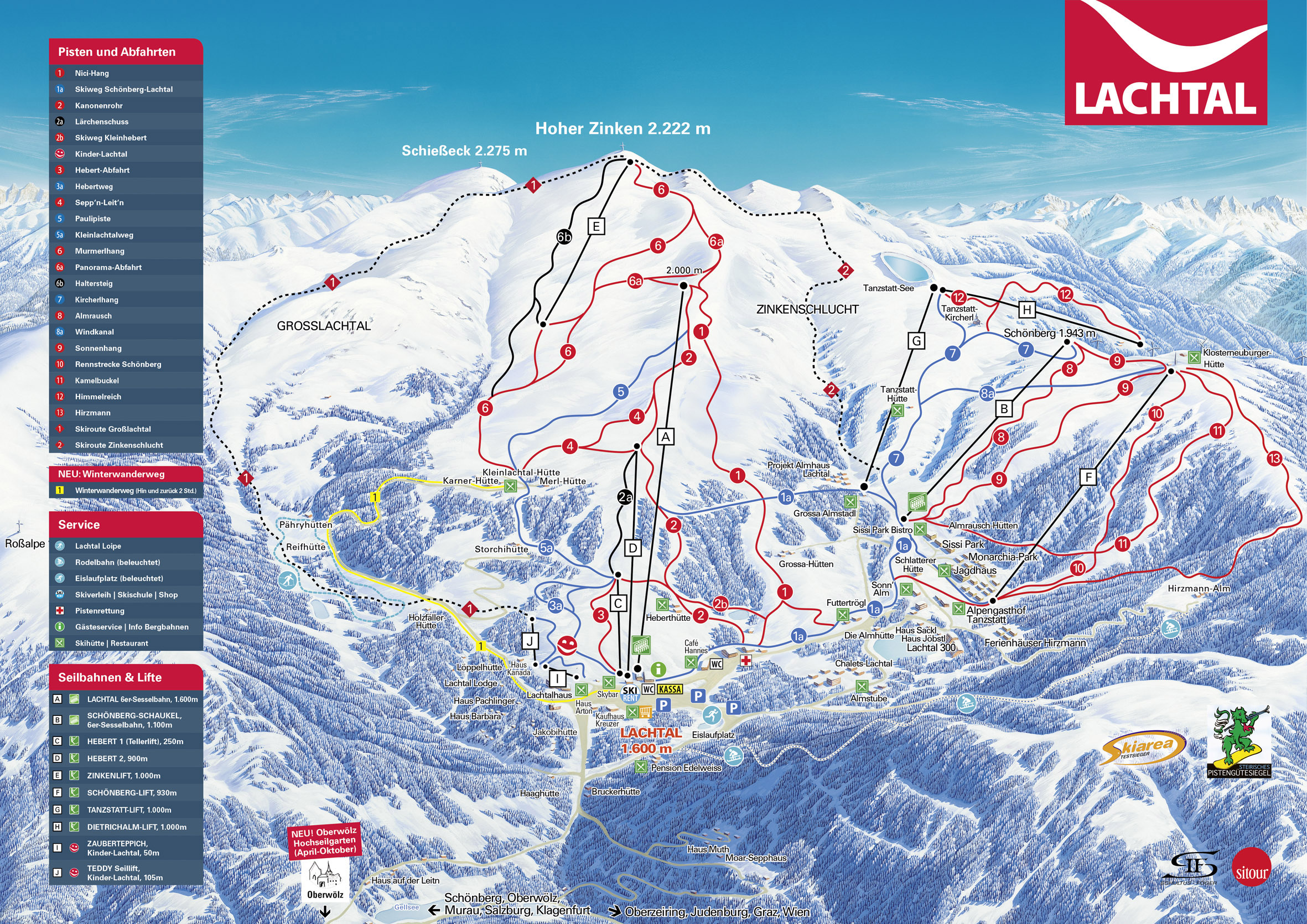 Lachtal síterepe Magyarországról néhány óra alatt elérhető, ezért is kedvelt téli üdülőhely a magyarok körében. Az 1.600-2.220 méter magasságban fekvő, 25 kilométer sípálya alkotta sípályarendszer Schönberg-Lachtal településről induló felvonókkal érhető el. A hatszemélyes Lachtalbahn felvonóval 2.000 méter magasra érhetünk, majd a Zinkenlift felvonóval elérhetjük a 2.220 méteres Hoher Zinken csúcsot. Lachtal síterepén többségében piros jelzésű sípálya fogadja a síelőket, de a lankásabb lejtőkön a kezdő síelők is élvezhetik a síelést. A sípálya alsó részén a Kinder-Lachtal gyermekpark tanuló felvonóval és játékos sípályával várja a kisebbeket. A snowboardozás és freeride síelés kedvelői a funpark akadályait próbálhatják ki. A szánkózni vágyók a Hirzmann-Alm 1,5 kilométer hosszú, kivilágított szánkópályáján csúszhatnak. Lachtal síterepe hóbiztos terület, hiszen kedvező fekvése és a hóágyók mind hozzájárulnak ahhoz, hogy akár áprilisig is eltarthasson a síszezon.