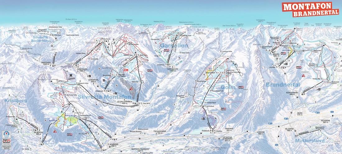 A 654-2.124 méter magasságban fekvő Golm hegyoldalára Tschagguns és Vandans városából juthatunk fel. A sok kék és piros sípálya kezdő és gyakorlott síelők számára is jó választás. A 889-1.580 méteren találjuk a mindössze pár kilométeres Kristberg síterepet, melyre a Silbertalból induló kabinos felvonóval érkezhetünk. Schafberg hegyoldalán 1.435-2.275 méter magasságban többségében lankás sípályákon csúszhatunk. Gargellenből a 8 személyes Schafbergbahn kabinos felvonóval rögtön 2.130 méter magasságba érkezünk. A funparkban a snowboardosok változatos akadályokon mérettethetik meg magukat. A Montafon sírégió legnagyobb síterepe a 2011/12 óta egybesíelhető, 700-2.430 méteren fekvő Silvretta Montafon Hochjoch-Nova sípályarendszer. A síterep elsősorban középhaladó síelők számára ajánlott. A Nova Park Európa egyik legjobb snowboardparkja, ahol számos modern élményelem közül válogathatnak a snowboard rajongói. Brandnertal két síterepet jelent, az egyik Brand településről indul ki, a másik pedig Bürserberg köré épült. A két síterepet egy kabinos felvonó és síbusz is összeköti. Főként könnyű és középnehéz pályákat kínál a síelőknek.