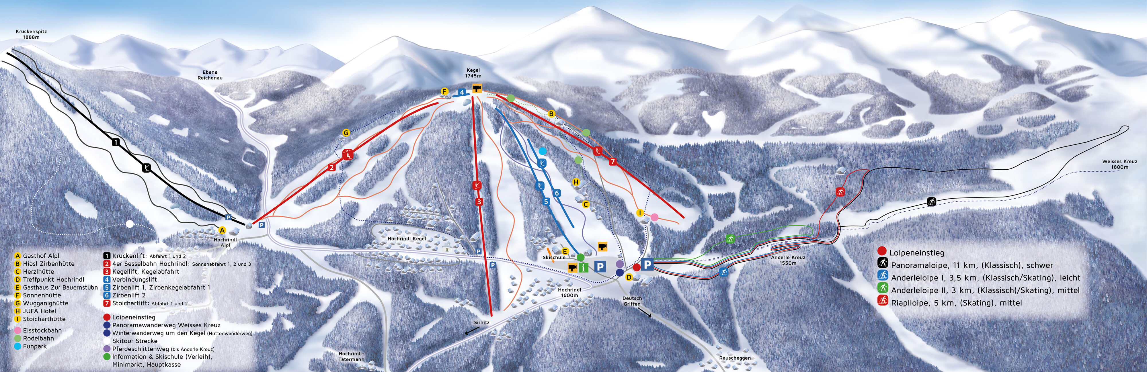 Sirnitz-Hochrindl síterepe 1.600-1.886 méter magasságban terül el. A 19 kilométeres sípályarendszer elsősorban gyakorlott síelők számára ajánlott. A sok piros sípálya mellett néhány kilométer meredek fekete és lankás kék szakaszon is lecsúzhatunk. Családoknak is jó választás Hochrindl síterepe, a gyermekeket tanuló sípálya és gyermekfelvonó segíti. A Kegel hegyoldalán 2 kilométer szánkópálya is van erdei szakaszokkal.