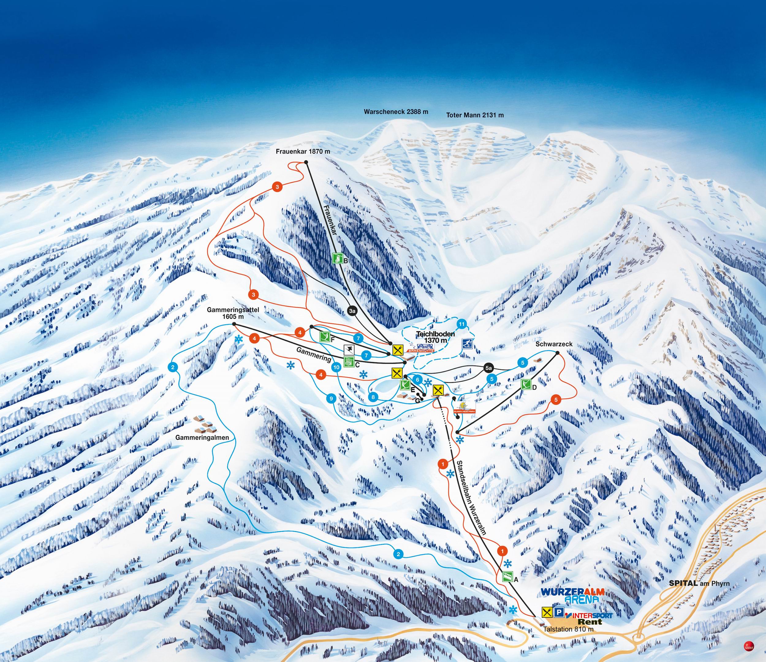 800-1.870 méter magasságban található Wurzeralm sípályarendszere. A 22 kilométer, jól karbantartott sípálya minden tudásszintű síelőnek ajánlott. Wurzeralm síterepe Európa leggyorsabb hegyi vasútjával érhető el, mellyel pár perc alatt a hegyre érhetünk. A vasút felső állomásától tovább indulhatunk, egészen az 1.870 méter magas Freuenkar csúcsig, ahonnan piros és fekete pályaszakaszokon csúszhatunk a felvonókig. A sípálya könnyebb, kék jelzésű szakaszokkal is várja a síelőket, melyen egészen az alsó állomásig lehet csúszni. Wurzeralm síterepén az időmérő Hahnlgraben versenypályán és a tréningekhez optimális Schwarzeck versenypálya tehetik próbára tudásukat a bátrabb síelők.